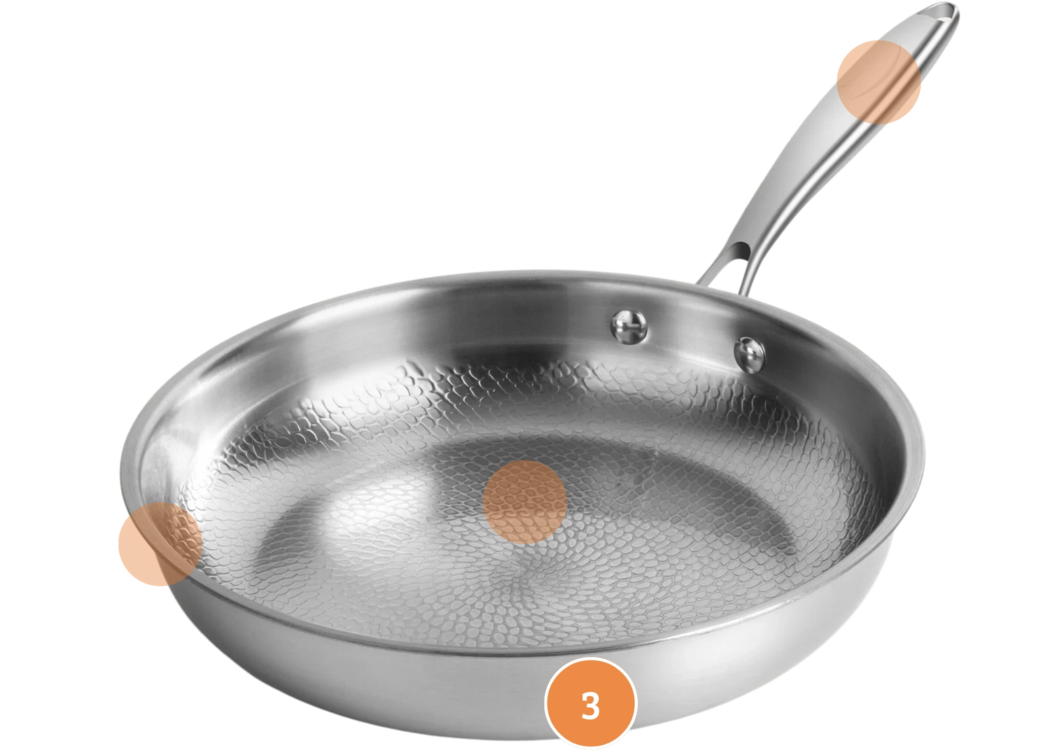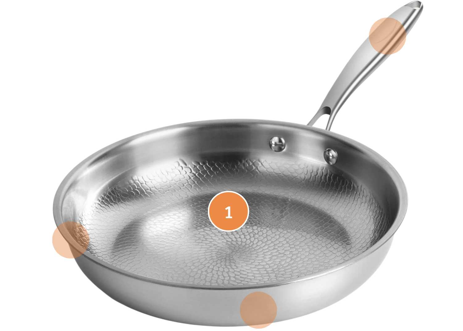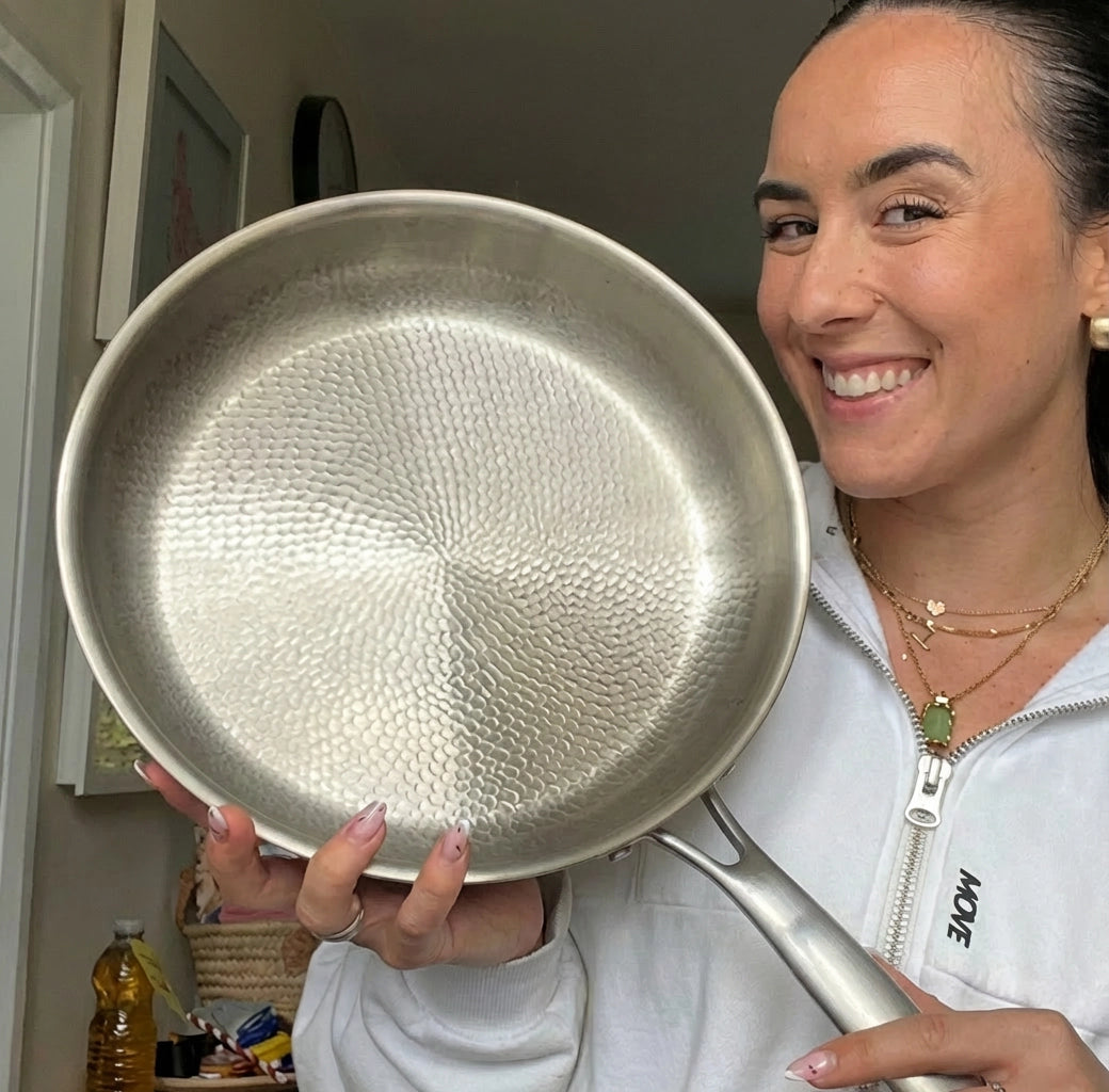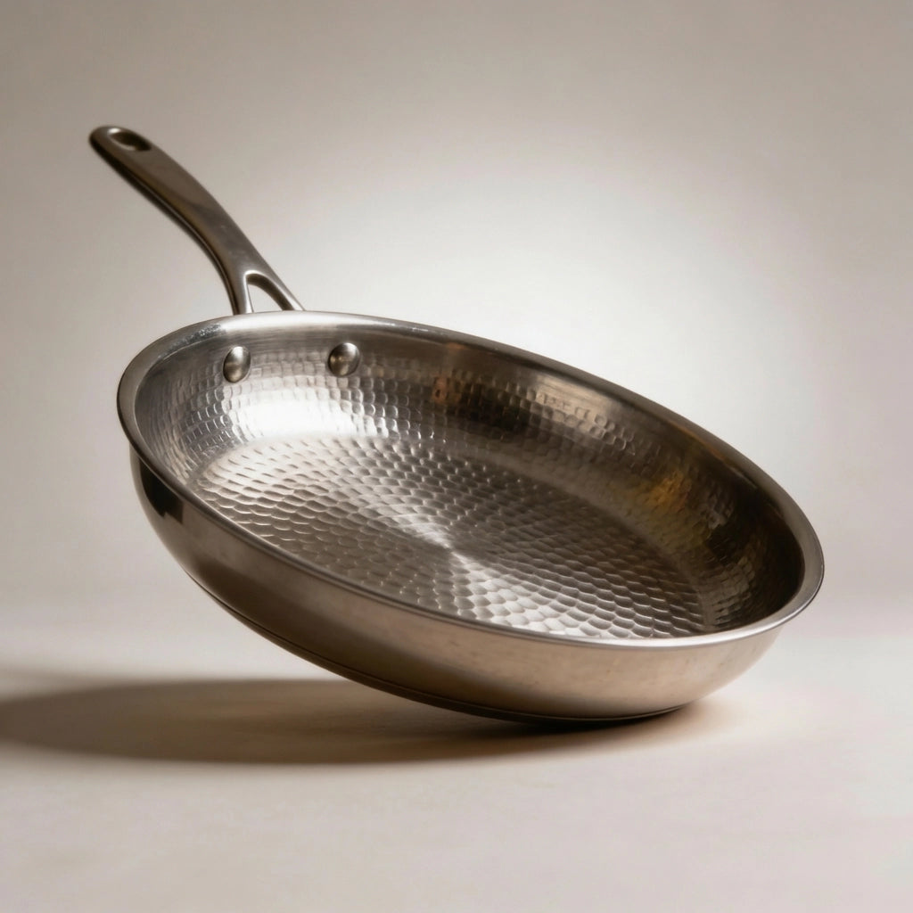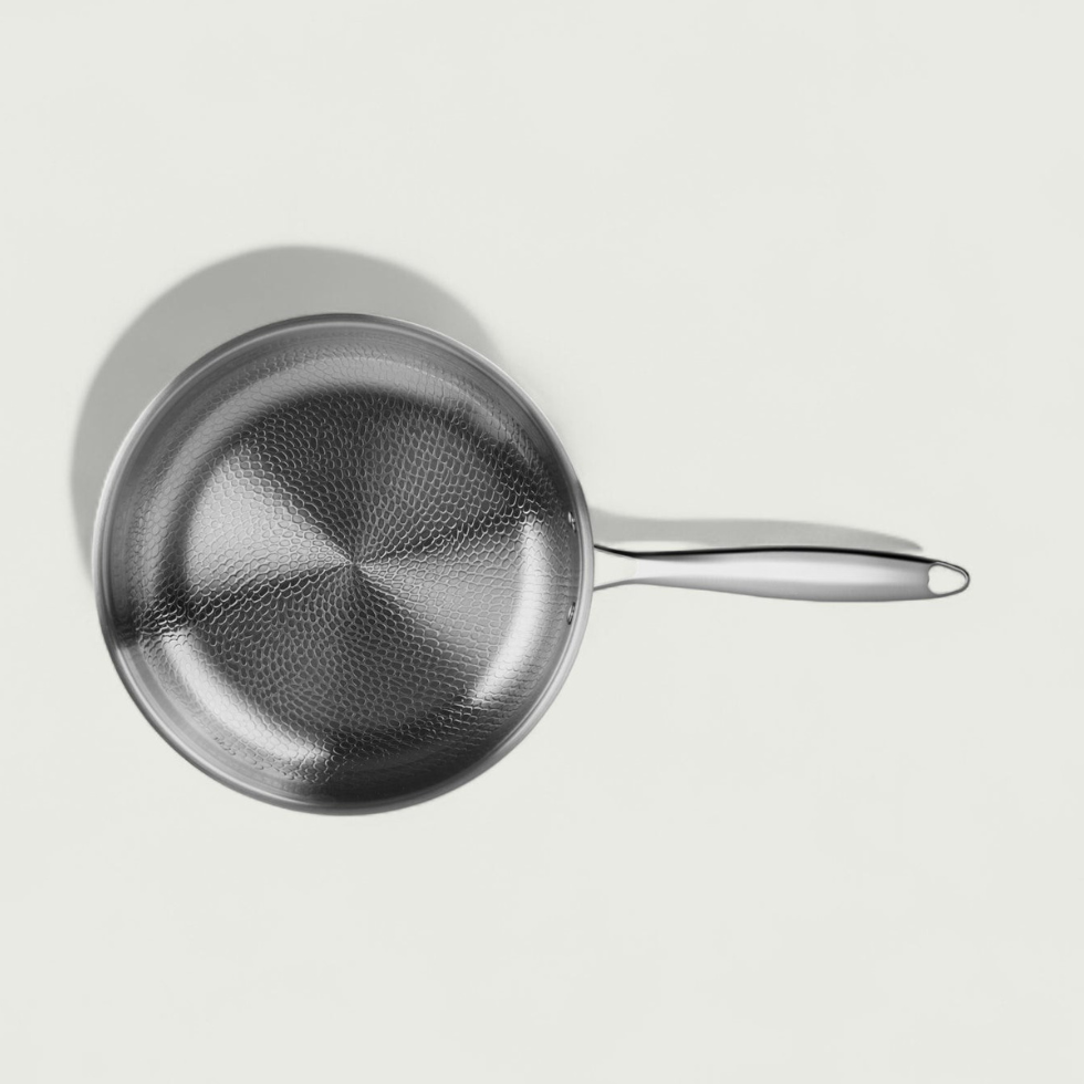La surface martelée réduit le contact avec les aliments, limitant l’adhérence et facilitant le nettoyage.